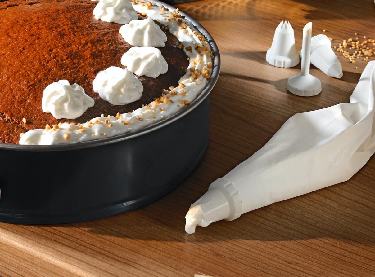 Mit einem Spritzsack oder einer Garnierspritze mit verschiedenen Aufsätzen können Sie Ihr Gebackenes nach Lust und Laune dekorieren. Ob Sie den Tortenrand mit Röschen verzieren (verwenden Sie dazu am besten eine Sterntülle), oder Ihren Cupcakes mit einem Swirl aus frischem Frosting und passiertem Obstmus ein perfektes Topping verleihen, bleibt ganz Ihrer Fantasie überlassen.