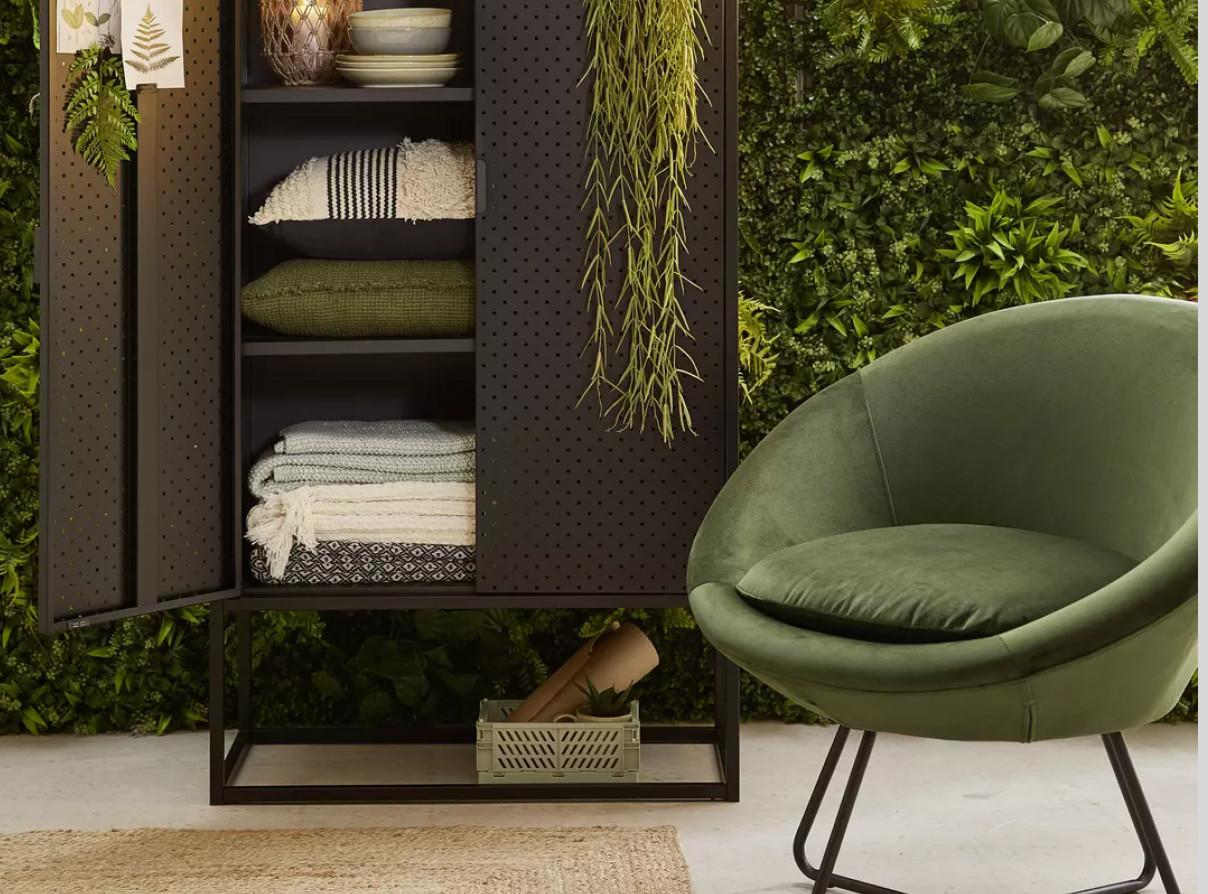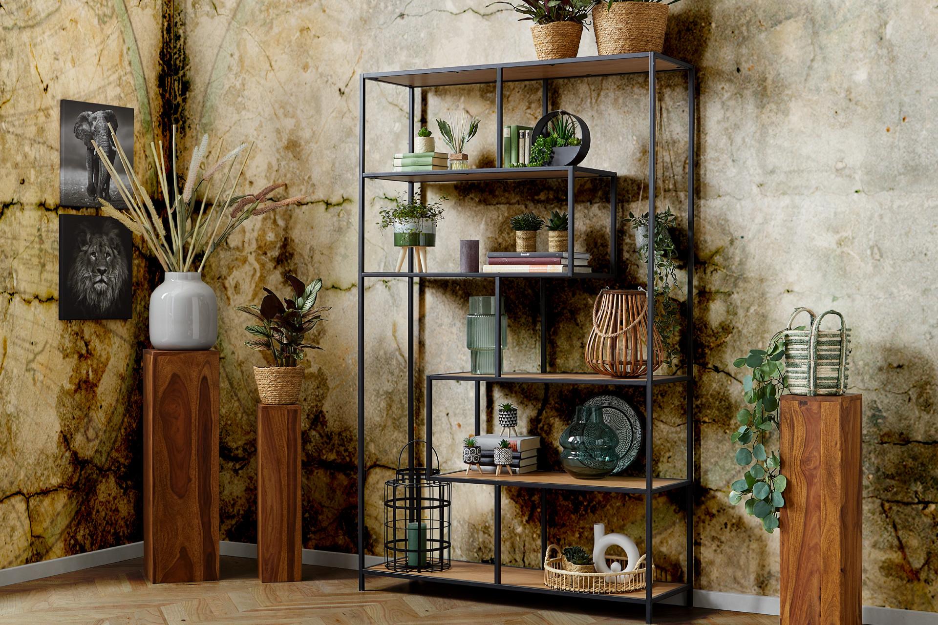 Auch bei den Möbeln herrscht der Naturgedanke vor. Möbel aus Tropenhölzern kombinieren Sie am besten mit bequemen Polstermöbeln. Dunkle Regale im Industrial Style erinnern ans Gewächshaus und bieten viel Platz für die grüne Pflanzenpracht.