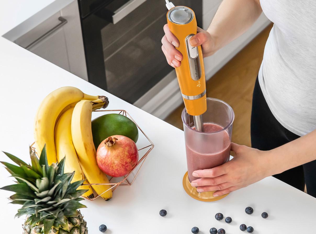 Mit einem Stabmixer verwandeln Sie Obst und Gemüse in Windeseile in Mus, Sugo und Brei. Auch Marmelade können Sie nach dem kurzen Kochen je nach Vorlieben sehr fein oder mit Stückchen pürieren.