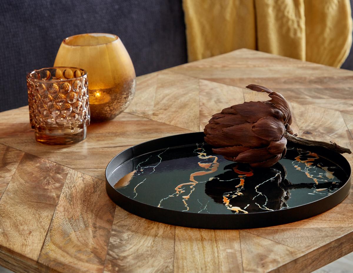 Spielen Sie mit Mustern, Ornamenten, Blüten und Blättern. Die Farben orientieren sich an Gewürzen, die Sie am orientalischen Markt finden würden: Sand, Beige, Rot oder Orange. Gepaart werden sie mit dunklen Nuancen wie z.B. Nachtblau.