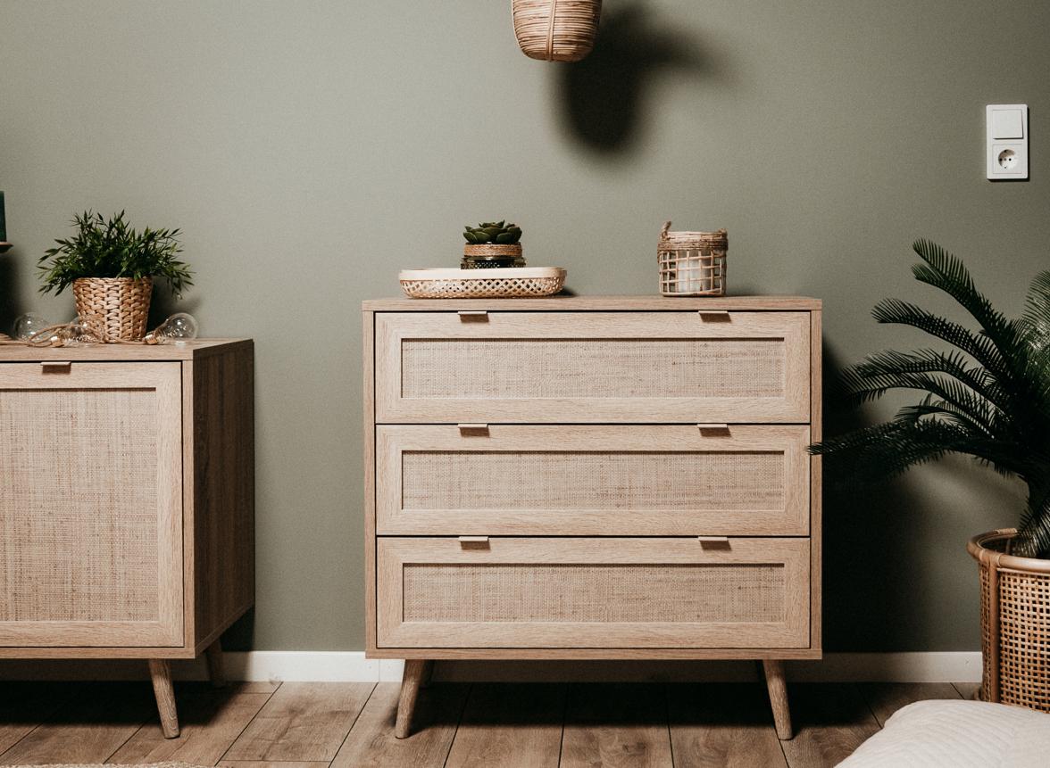 Hinter der geschlossenen Front einer Kommode befinden sich Schubladen und Fächer. Hier können Sie Geschirr, Tischtücher und andere Utensilien verstauen, ohne dass es unordentlich aussieht.