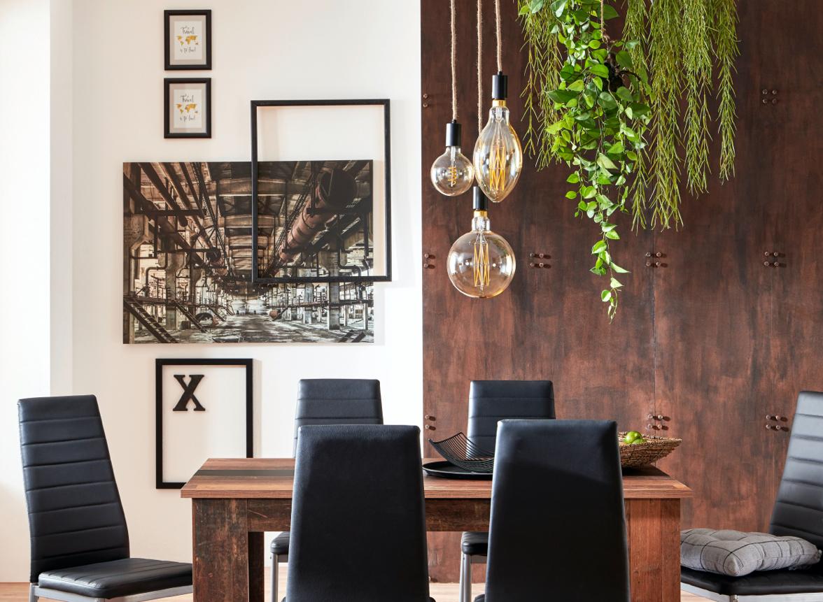 In einem großen Esszimmer können Sie so richtig auf den Putz hauen! Streichen Sie z. B. eine Wand in einer knalligen Farbe oder verwenden Sie dunkle Möbel im Industrial Chic. Rahmen Sie Ihren Essplatz mit einem großen Teppich ein: Das gibt dem Raum Struktur und verleiht ihm gleichzeitig Gemütlichkeit. Tipp: Auch Vorhänge vermitteln das Gefühl von Geborgenheit. Ihre Fähigkeit, Schall zu schlucken, macht sich gerade bei Essen in größeren Runden bezahlt.