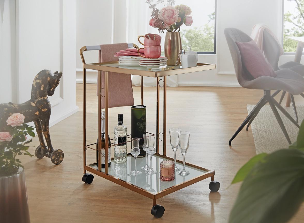 Ein Servierwagen verhält sich wie ein mobiles Miniatur-Sideboard. In kleinen Räumen, die keinen Platz für große Stauraummöbel bieten, springen Sie als Ablageort für oft benötigte Gegenstände ein. Oder Sie präsentieren bei Ihrer nächsten Dinnereinladung Getränke und Desserts darauf.