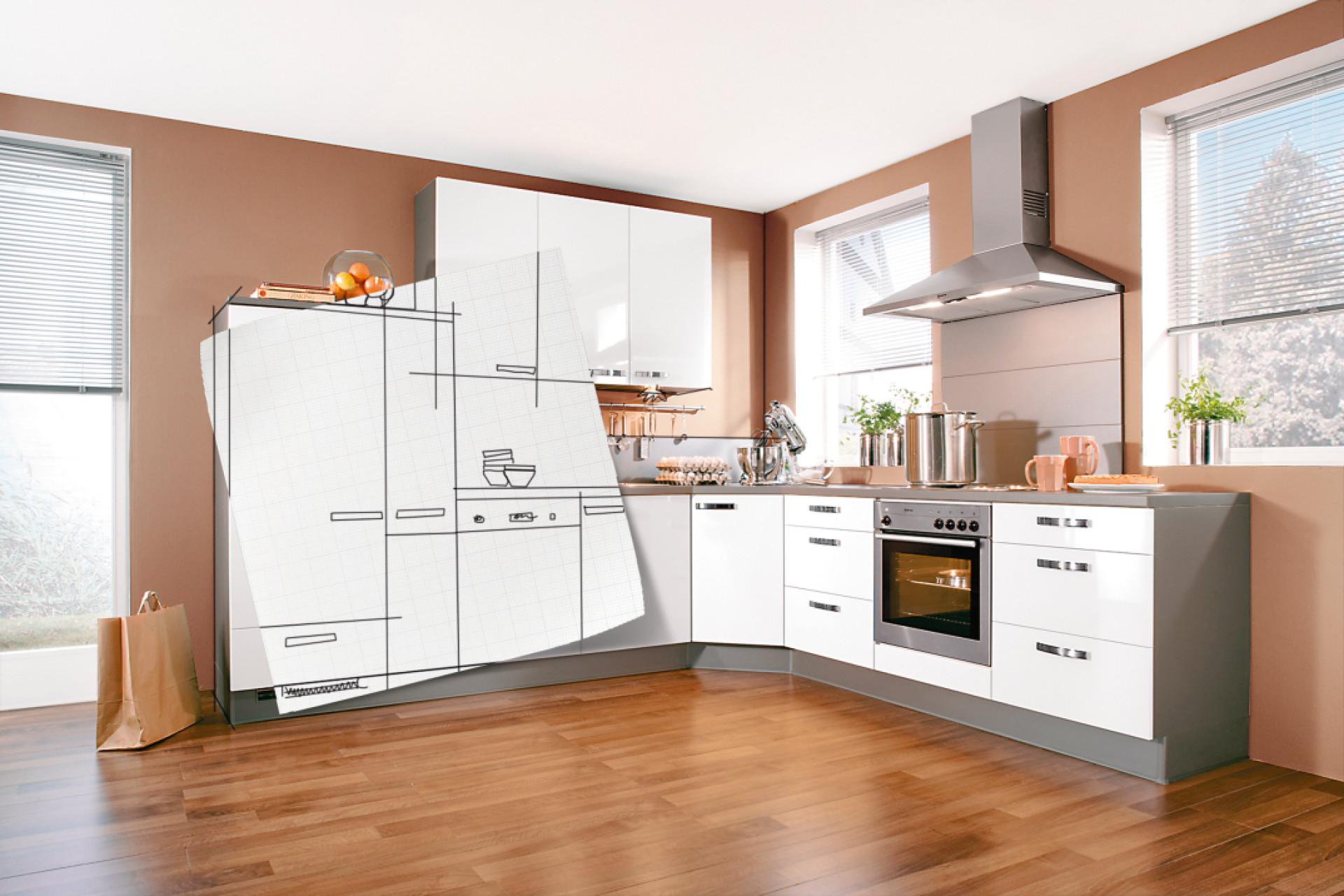 Wie groß ist meine Küche? Ist sie Teil des Wohnraums? Wo befinden sich Türen und Fenster? Möchte ich auch einen Essplatz unterbringen?