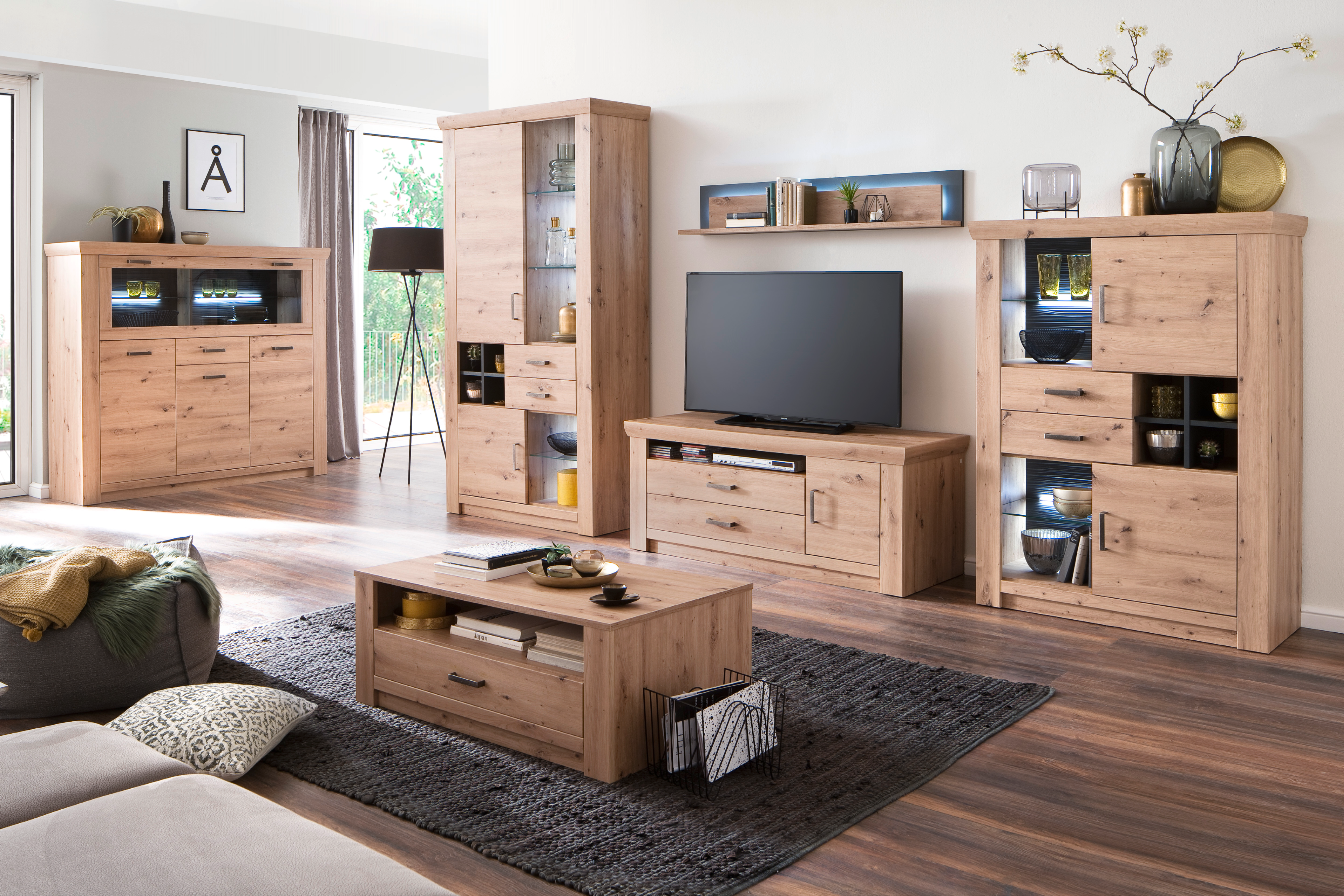 Landhaus-Idylle mit modernem Charakter: Die Wohnserie MERAN in Eiche Dekor mit natürlich anmutender Maserung und nickelfarbenen Bügelgriffen schafft eine gemütliche Atmosphäre in Ihrem Zuhause. Mit diesem Wohnprogramm statten Sie den Wohnbereich und das Speisezimmer mit viel Stauraum aus. Großzügige Sideboards und Vitrinen, kompakte TV-Elemente und Wandboards ergeben einen stilsicheren Mix aus offenen und geschlossenen Aufbewahrungsmöglichkeiten. Kombinieren Sie die Einzelmöbel ganz nach Ihrem Geschmack, damit hochwertiges Geschirr, Bücher und dekorative Lieblingsstücke einen entsprechenden Platz bekommen. Dank Soft-Close-System ist für leises Schließen der Türen und Laden gesorgt. Das Beste: Der moderne Esstisch dieser Serie ist ausziehbar. Die Wohnserie MERAN ist somit perfekt für Familien und alle, die gerne Gäste einladen.