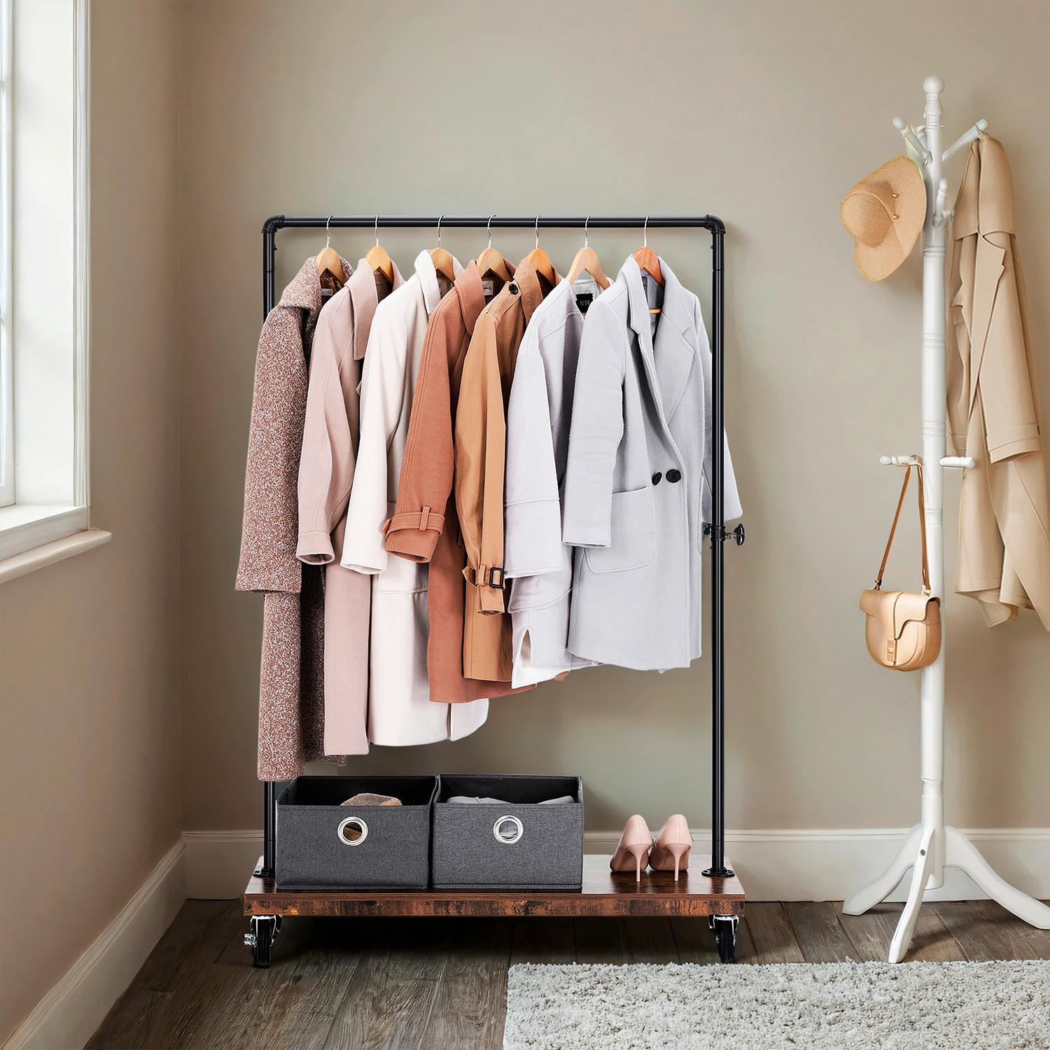 Rollen – sogenannte Kleiderwagen – lassen sich unkompliziert umplatzieren, egal ob der Kleiderständer Schlafzimmer, Garderobe oder Büro mit mobilem Stauraum ausstatten soll.