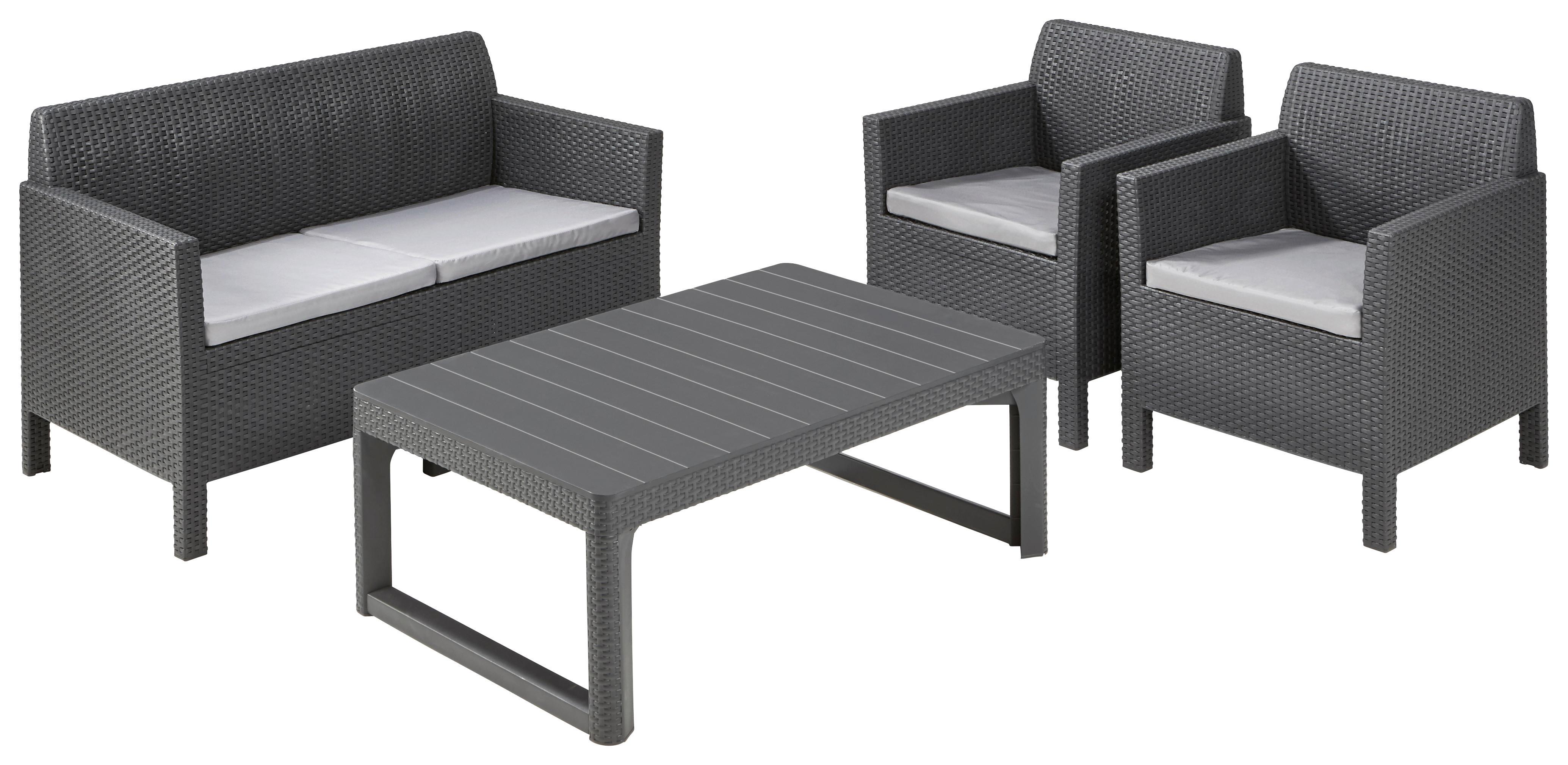 Die Loungegarnitur ORLANDO von ALLIBERT steht für unprätentiöses Möbeldesign. So sind die zwei Sessel, die Sitzbank und auch der Tisch ausgraphitfarbenem Kunststoff gefertigt. Nichtsdestotrotz sorgen die Armlehnen sowie auch die hellgrauen Sitzpolster der ca. 126 x 65 x 75,5 cm (B x T x H)Sitzbank sowie der 65 x 65 x 75,5 cm (B x T x H) großen Sessel für eine gute Portion Bequemlichkeit.