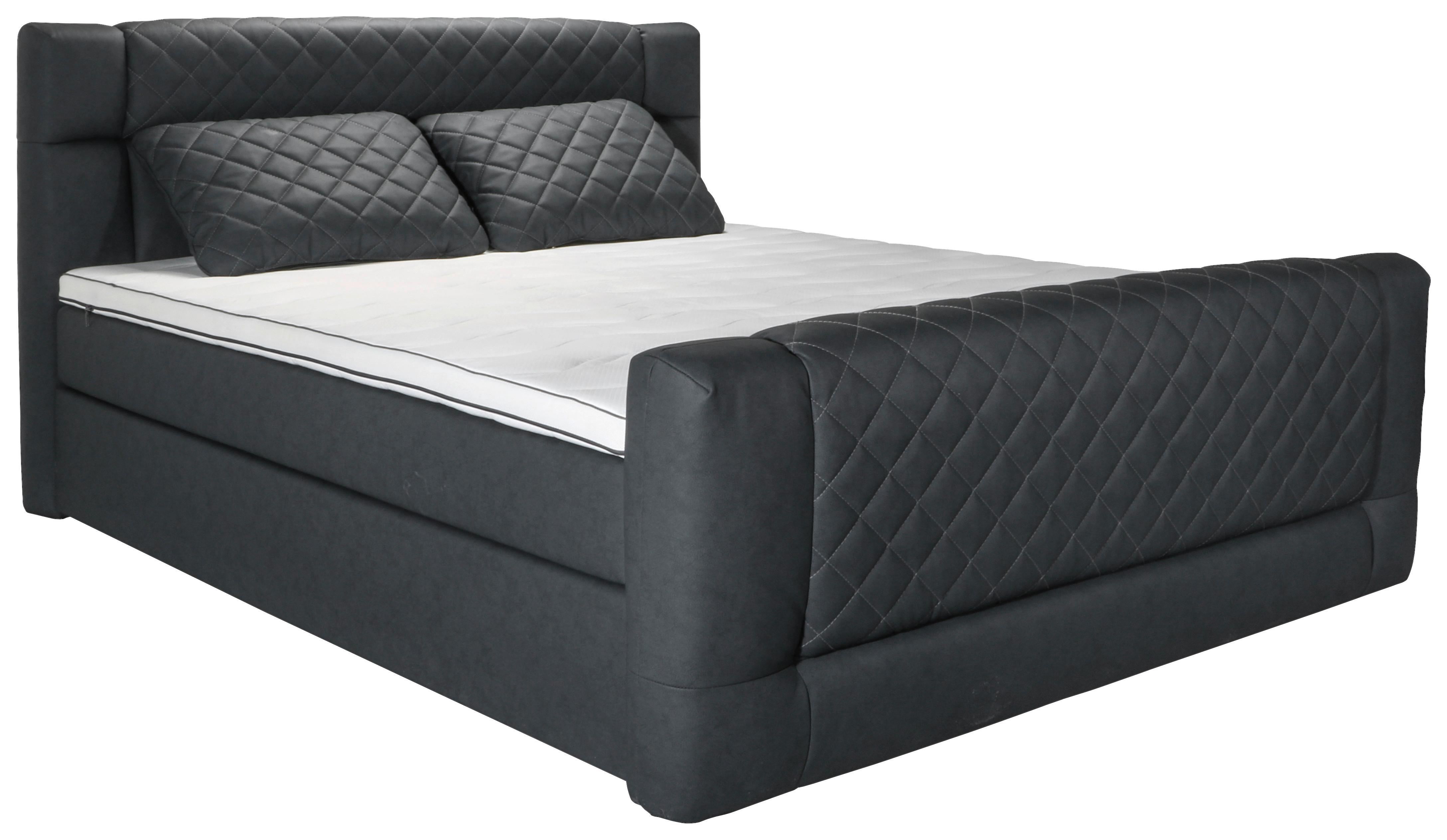 Schlafen wie in Abrahams Schoß werden Sie mit dem Boxspringbett SIGN II. Und gleichzeitig wird Ihnen das edle Design aus anthrazitfarbener Leder-Optik mit gepolstertem Kopfteil sowie der Fußbank gefallen. Vor allem, da Kopf- und Fußbank mit einer Karosteppung verziert sind. Schwarze, ca. 3,5 cm hohe Füße runden den großartigen Gesamteindruck des ca. 236 x 118 x 189 cm (L x H x B) großen Bettes überzeugend ab.