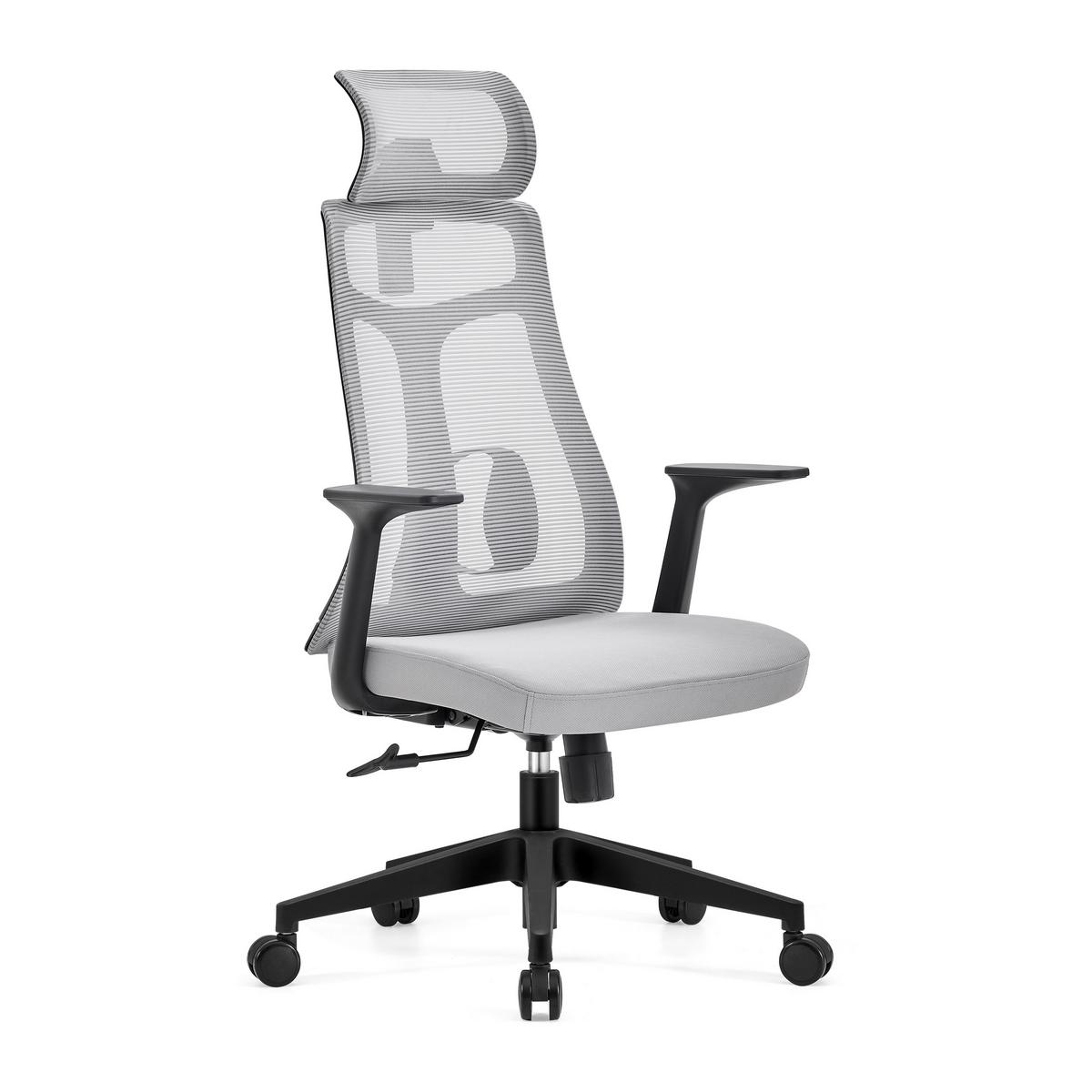 Der Chefessel DAVOS in Grau bietet eine ergonomische Rückenlehne aus Mesh und ein schwarzes Gestell mit fünf Beinen. Die Sitzhöhe ist per Gaslift von 48 bis 58 cm verstellbar.