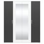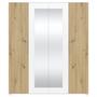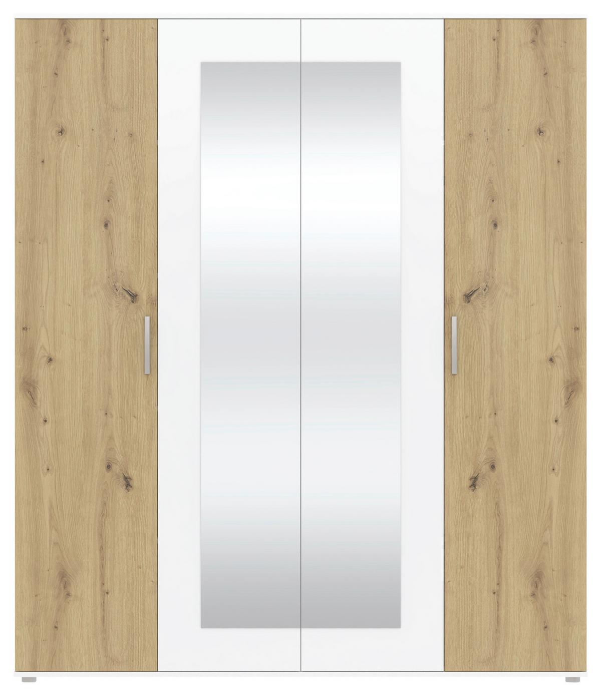 Drei der fünf Böden sind verstellbar. Die äußeren Türen in Eiche Artisan Dekor werden mit Bügelgriffen geöffnet. Die beiden Spiegeltüren befinden sich in der Mitte und sind elegant eingerahmt in schickem Weiß.