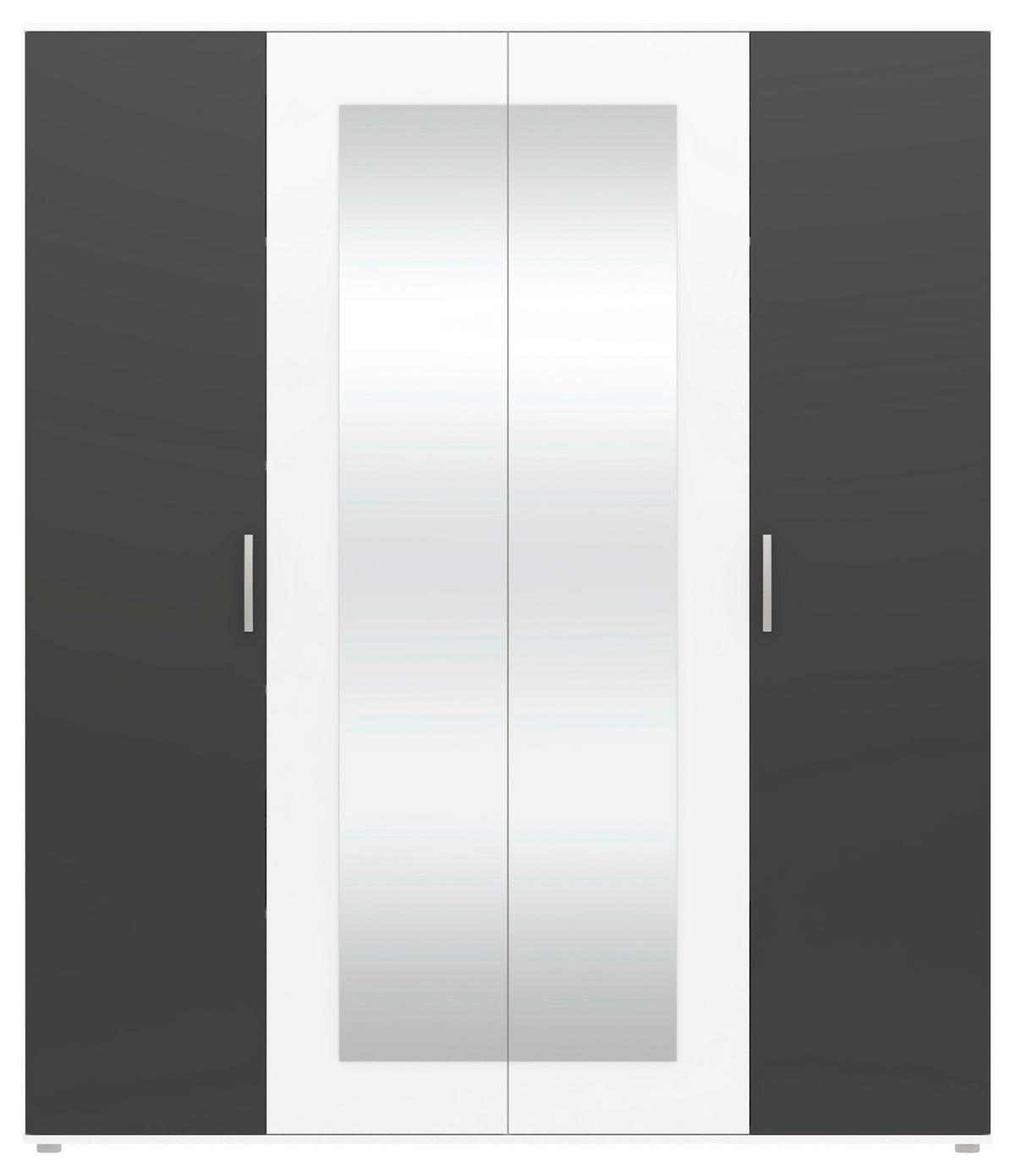 Drei der fünf Böden sind verstellbar. Die äußeren Türen in Anthrazit werden mit Bügelgriffen geöffnet. Die beiden Spiegeltüren befinden sich in der Mitte und sind elegant eingerahmt in schickem Weiß.