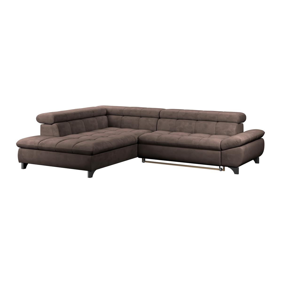 Das Ecksofa GEMINI kombiniert modernes Design mit hohem Komfort. Bezogen mit weichem Chenille-Stoff in Dunkelbraun und ausgestattet mit drei verstellbaren Kopfstützen, lädt es zum Entspannen ein.
