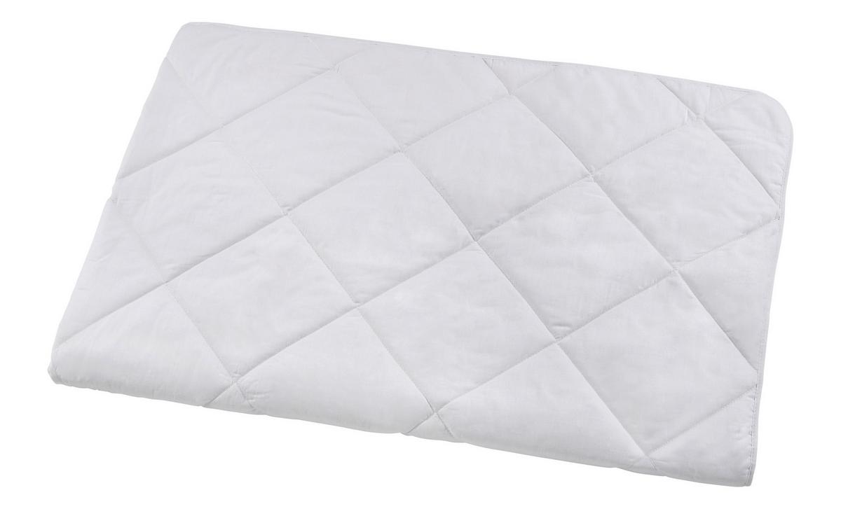 Der Bezug der ca. 140 x 200 cm (B x L) großen Decke aus 100 % Baumwolle sorgt für ein angenehmes Hautgefühl. Mit der rautenförmigen Steppung und dem leichten Material ist sie ideal für warme Nächte.