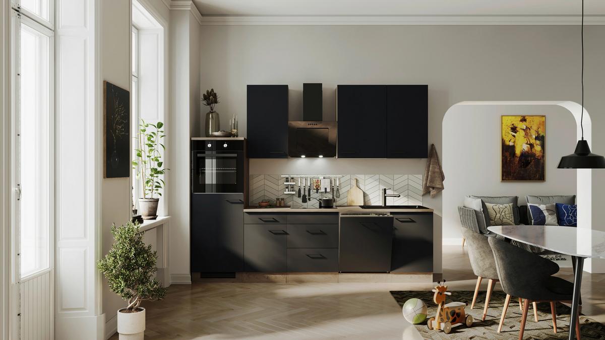 FlexWell Küchenblock Capri Eiche/Schwarz B: 280 cm Front: Schwarz • Korpus: Endgrain Oak • Arbeitsplatte: Eiche Dekor • Breite: ca. 280 cm • Inkl. 5 Geräte und Spüle