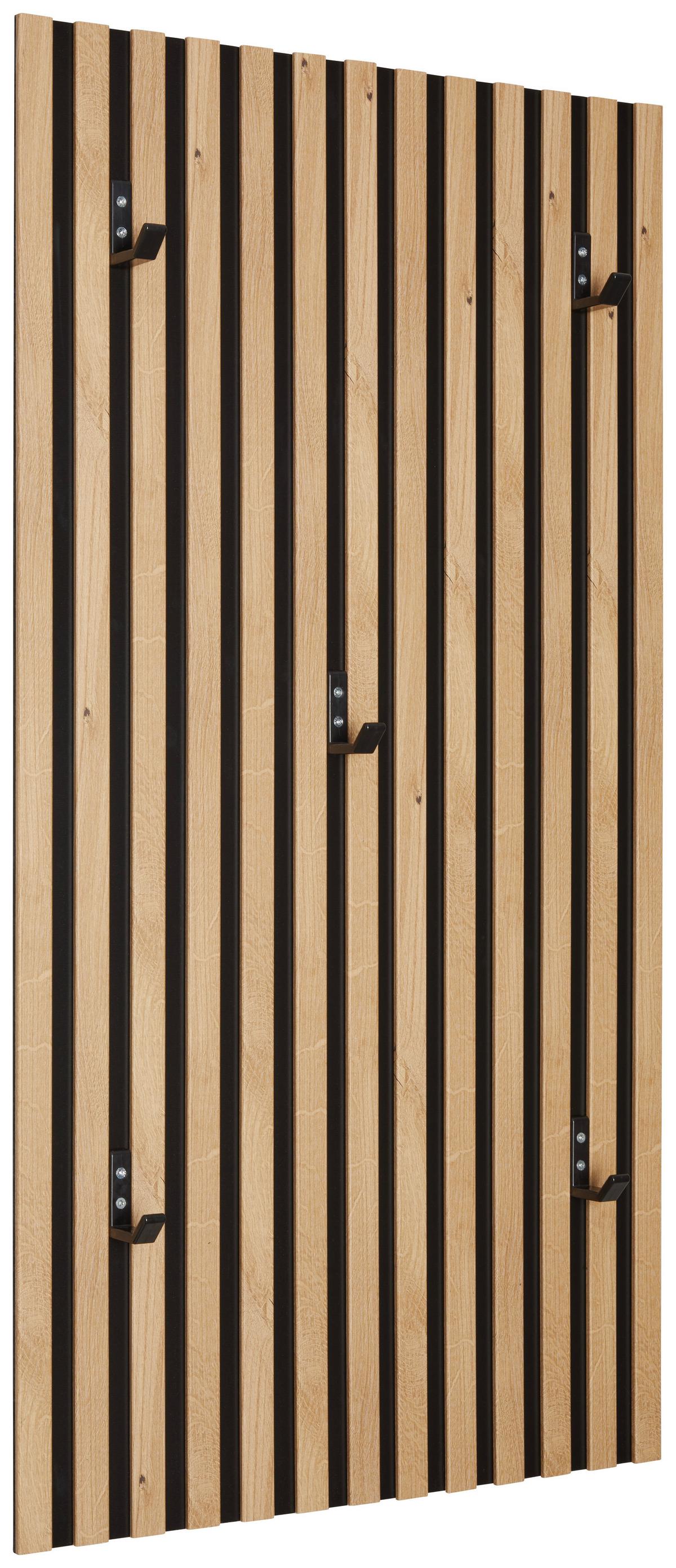 Es besteht aus sechs vertikalen Holzdekor-Streben in Eiche und ist mit 13 Kleiderhaken ausgestattet – ideal zum Aufhängen von Jacken, Taschen oder Schals. Dank der schlanken Maße von ca. 52,7 x 100 x 8,3 cm (B x H x T) eignet sich das Paneel auch für schmale Flure oder kleine Eingangsbereiche.