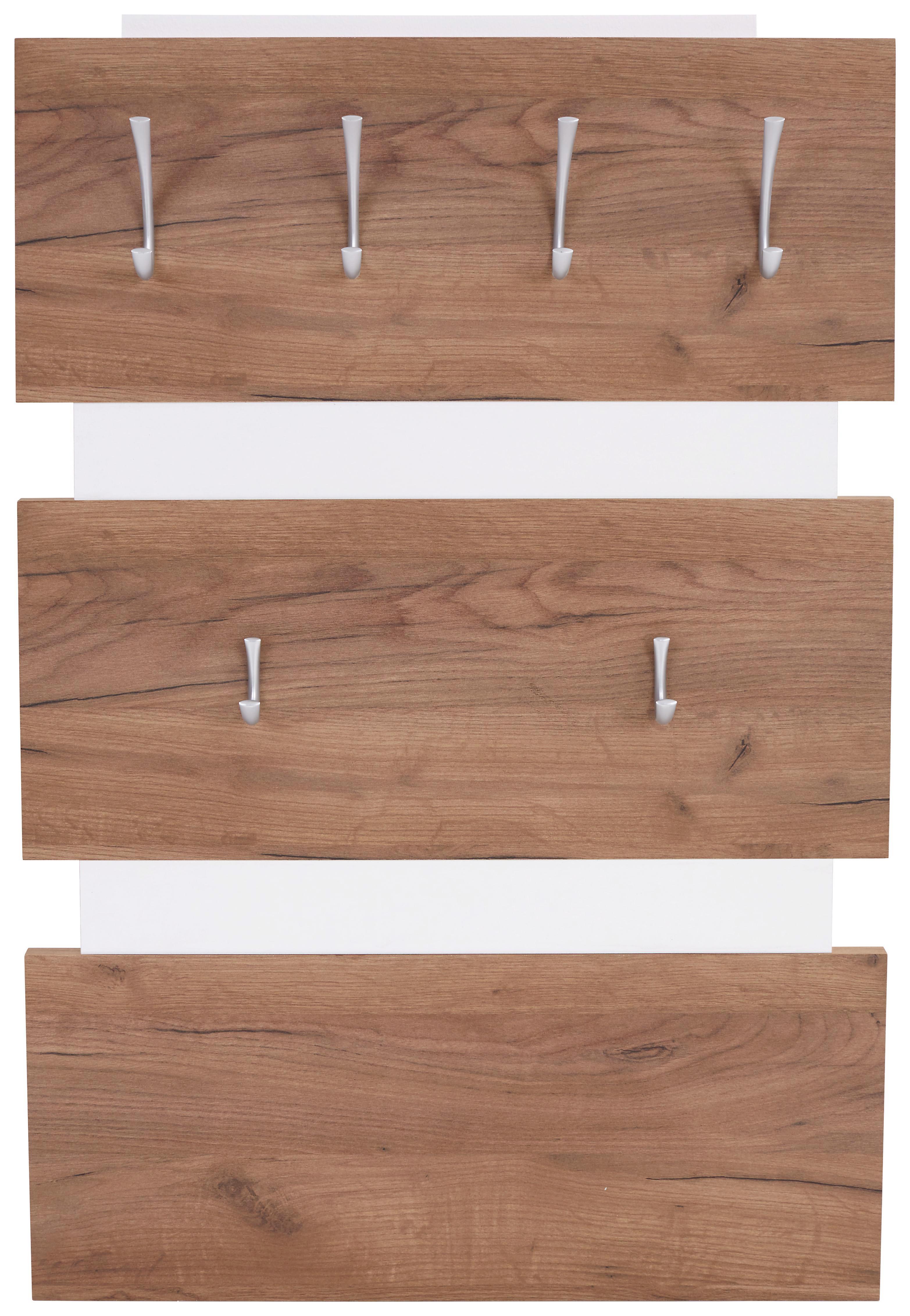 Dieses moderne Garderobenpaneel in Kraft Eiche dunkel Dekor und Weiß ist ein schickes Accessoire fürs Vorzimmer oder den Eingangsbereich. Das 3-teilige Garderobenpaneel mit einer Größe von ca. 70 x 99 x 2 cm (B x H x T) verfügt über 4 große und 2 kleine Metallhaken. Auf diesem zeitlosen Garderobenpaneel sind Jacken, Mäntel, Taschen u.v.m. bestens aufgehoben und immer griffbereit!Die wichtigsten Infos auf einen Blick: