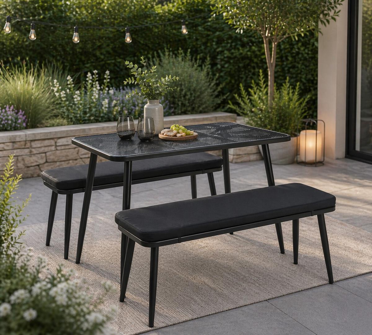 Praktisch und preiswert: Das dreiteilige Gartenmöbelset mit rechteckigem Tisch und zwei Bänken besteht aus Metall und bietet bis zu vier Sitzplätze im Freien. Inklusive Sitzauflagen. Das Set wiegt ca. 15 kg.
