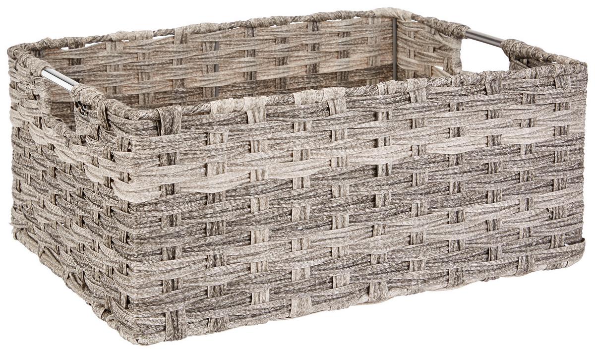 Der ca. 40 x 30 x 18 cm (L x B x H) große Regalkorb JANDRA der Marke JAMES WOOD hat ein Fassungsvermögen von 21 Litern und hilft Ihnen dabei Ordnung zu halten. Durch sein dezentes Grau passt der geflochtene Korb aus Kunststoff in jedes Badezimmer.