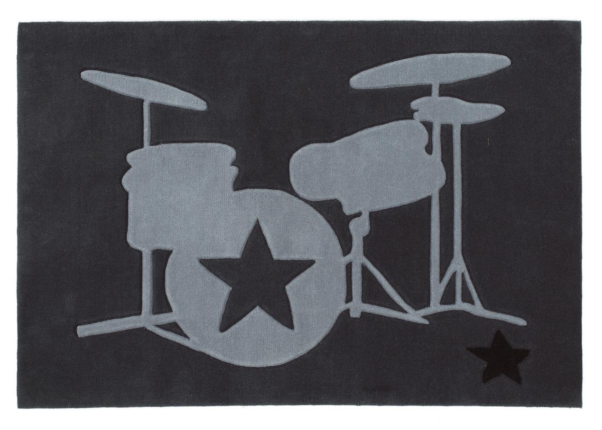Der rechteckige Kinderteppich RS-708 "Rock Star" in Schwarz und Hellgrau mit den Maßen von etwa 160 x 230 cm (B x L) begeistert alle coolen Kids und Teens. Das Schlagzeug-Motiv lässt keine Fragen offen.