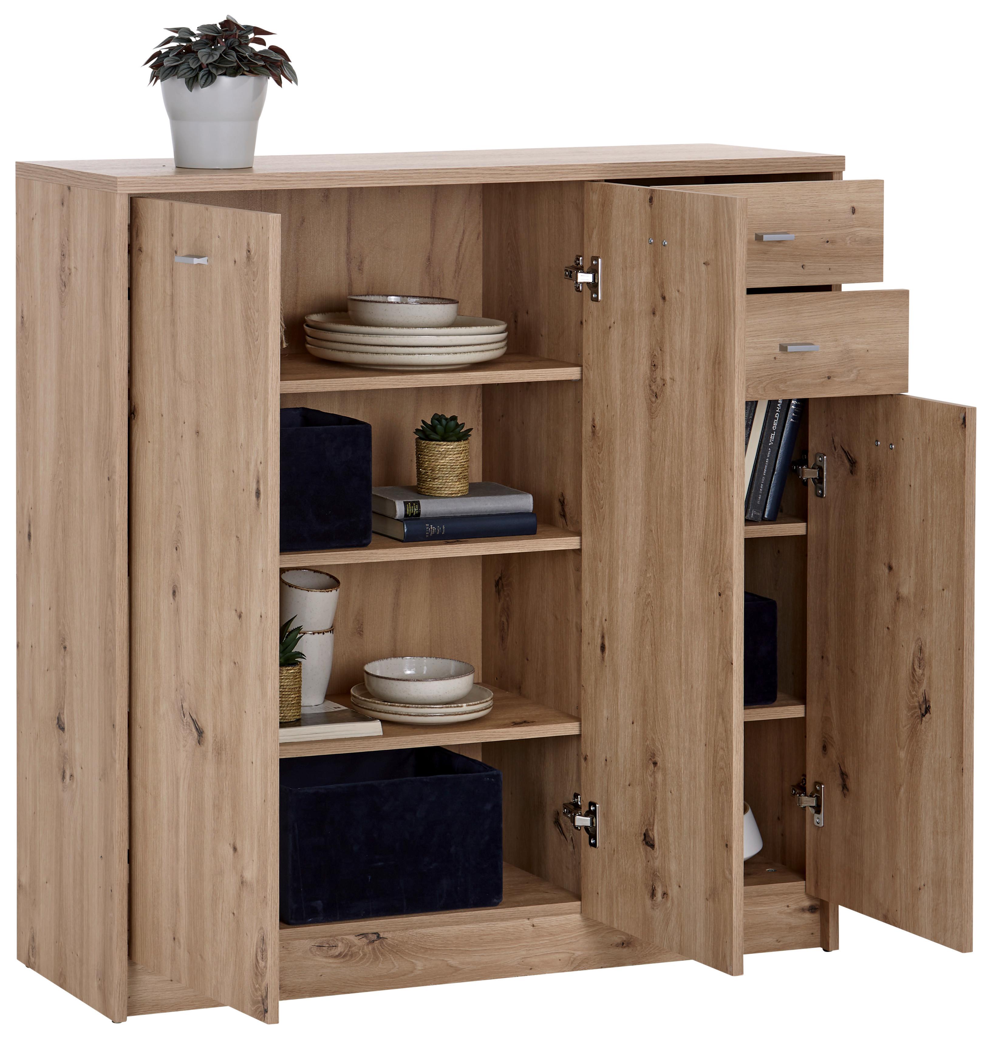 4-YOU NEW verfügt über wendige Maße von ca. 109,1 x 111,4 x 34,6 cm (B x H x T) und ist gefertigt aus robustem Holzdekor. Die Oberflächen in Artisan Eiche schmeicheln mit authentischer Maserung und warmen Holztönen. Silberfarbene Griffleisten vollenden das Design mit funktionaler Eleganz.