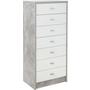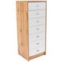 Der Korpus in Eichefarben verleiht dieser Kommode ein natürliches Flair und den hellen Fronten einen aktuellen Rahmen. Das Möbelstück verfügt über sieben Laden mit einem angenehm übersichtlichen Stauraum. Chromfarbende Griffe aus Kunststoff runden das Design gekonnt ab.