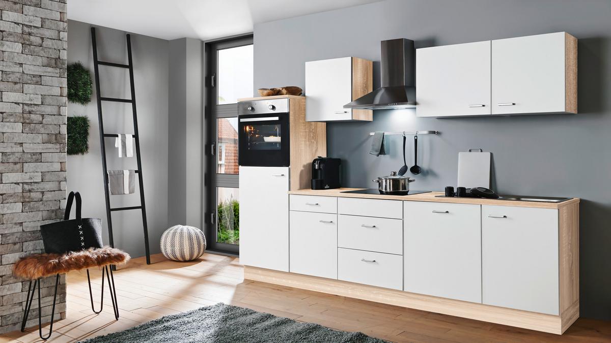 - Inkludierte Elektrogeräte: Backofen, Dunstabzugshaube, Geschirrspüler, Kühlschrank mit Gefrierfach, Glaskeramikkochfeld