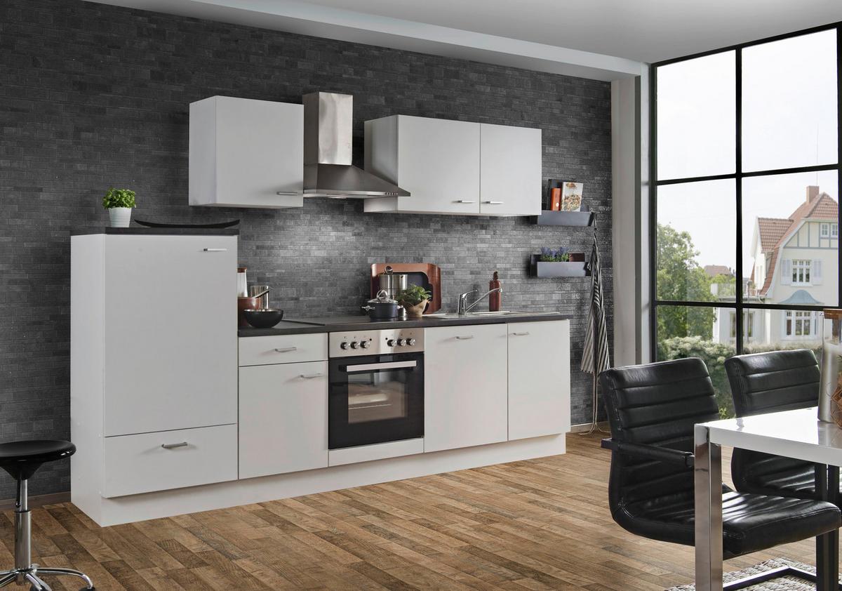 - Inkludierte Elektrogeräte: Dunstabzugshaube, Einbauherd, Geschirrspüler, Kühlschrank mit Gefrierfach, Glaskeramikkochfeld