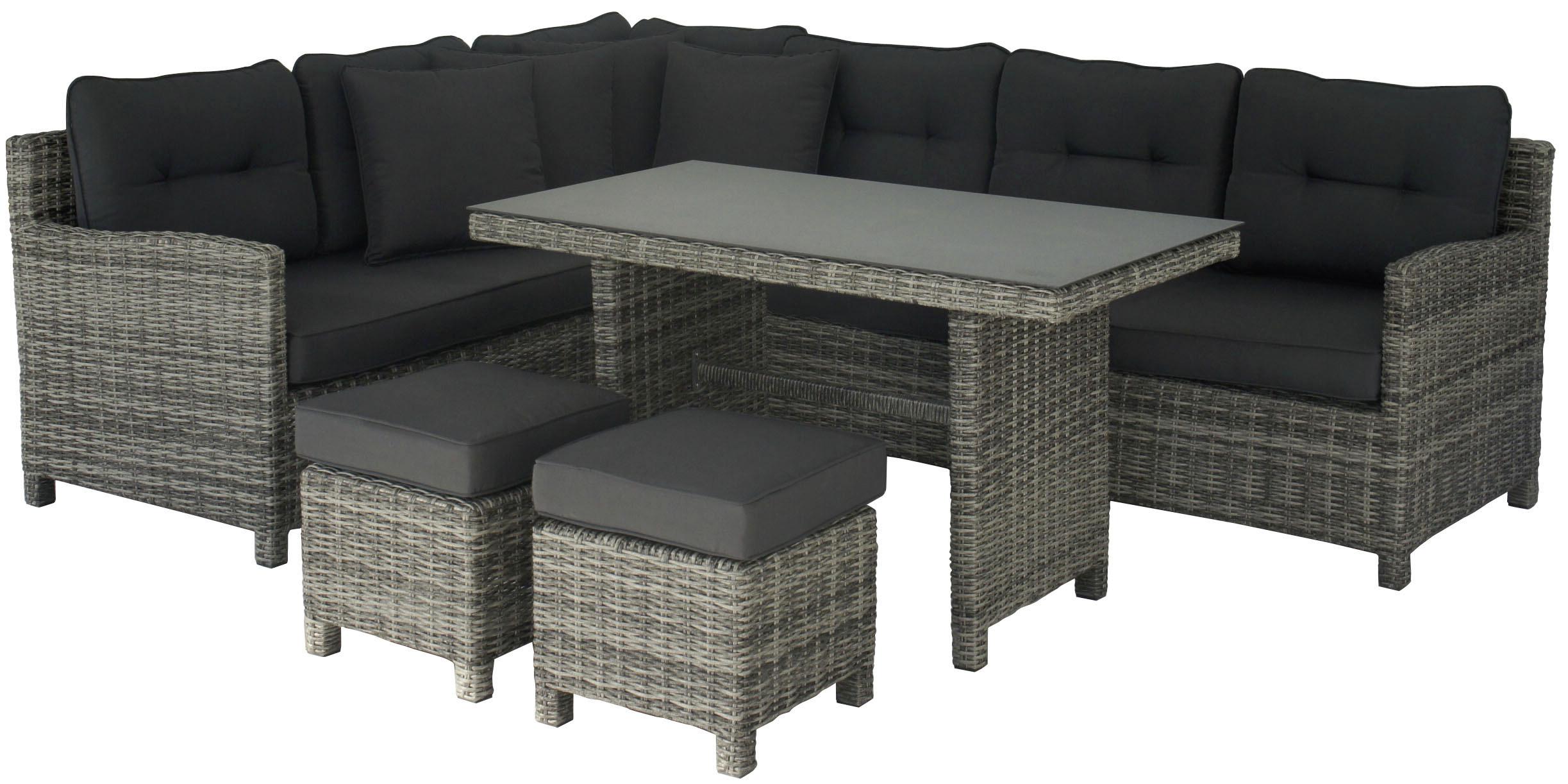 Dank der beiden zusätzlichen Hocker inklusive Sitzauflage haben auch überraschende Gäste immer Platz am Tisch! Aus wetterfestem Kunststoffgeflecht gefertigt, können Sie die Loungegarnitur außerdem beruhigt bei jedem Wetter im Garten oder auf der Terrasse stehen lassen. Eine ideale Ergänzung für jede Familie, die gerne Zeit im Freien verbringt!