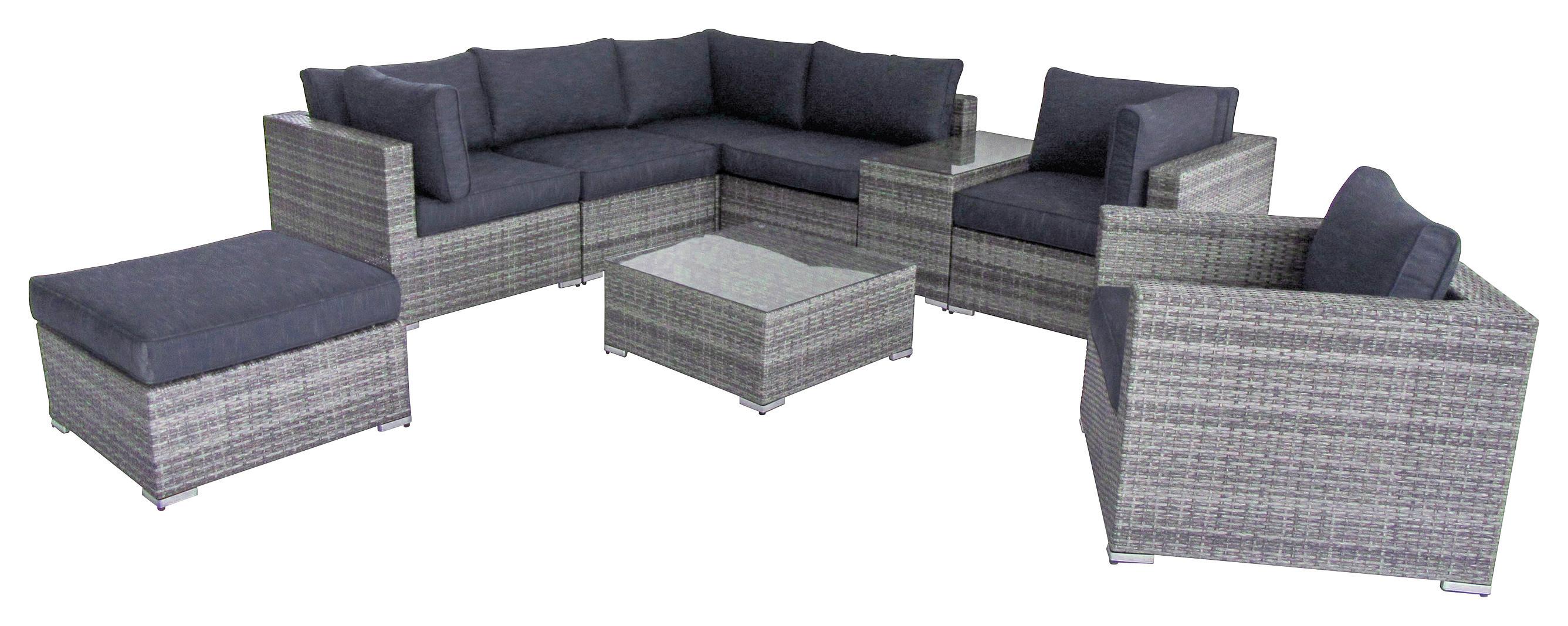 Die Loungegarnitur GENUA von LUCA BESSONI aus pflegeleichtem Polyrattan in edlem Grau in Schwarz wirkt elegant und einladend. Die drei Eckteile können mit den zwei Mittelteilen und dem passenden Beistelltisch individuell zu einem Gartenecksofa kombiniert werden. Ein gemütlicher Sessel und ein Hocker sowie der passende Tisch mit Glasplatte runden die Ausstattung ab.