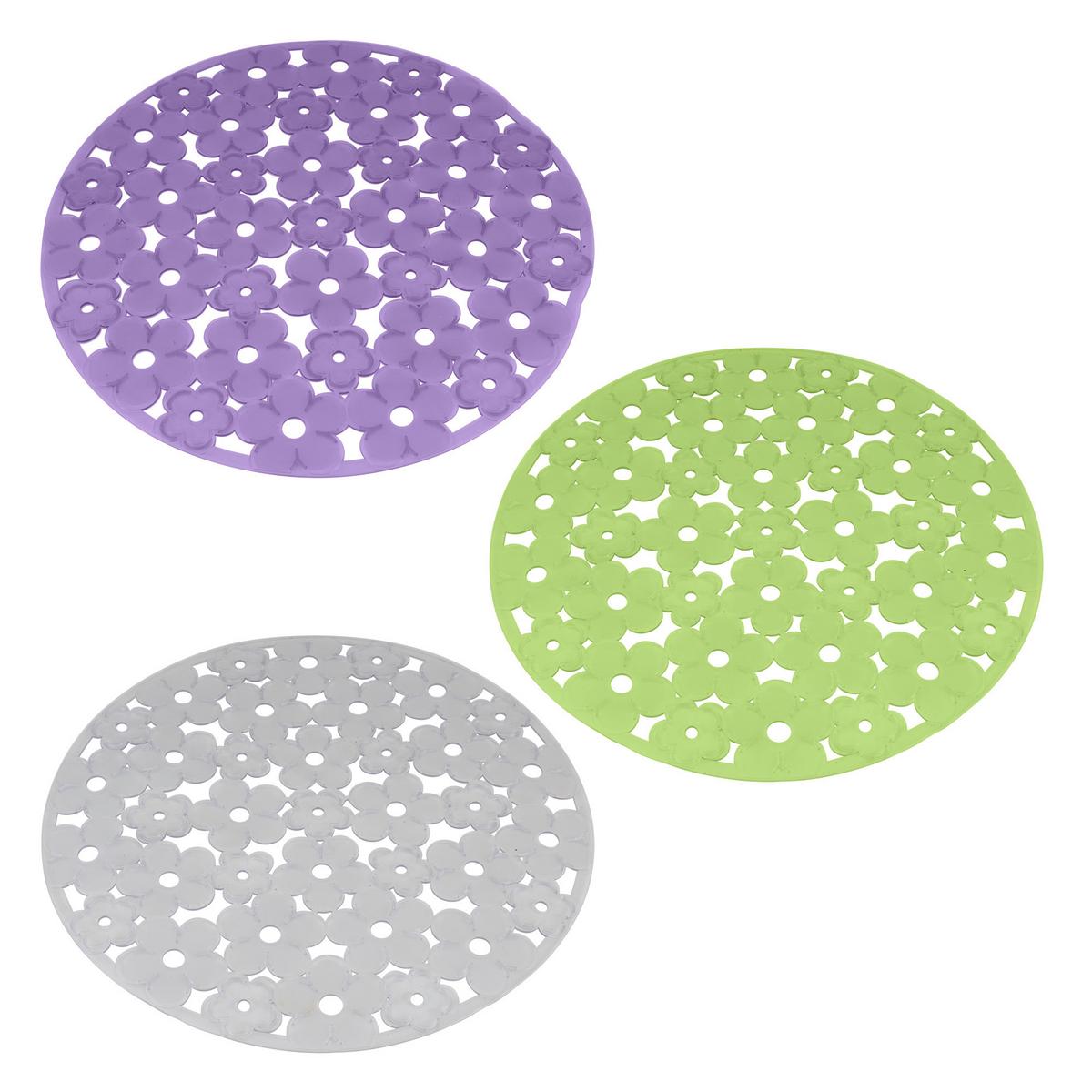 Die abwaschbare Einlage aus Kunststoff hat einen Durchmesser von ca. 30 cm und passt in handelsübliche, runde Spülbecken. Sie ist im Blumendesign gestaltet und in den Farben Lila, Grün und Transparent erhältlich. Dank der Abtropflöcher kann das Wasser gut abfließen.