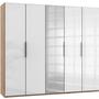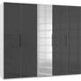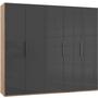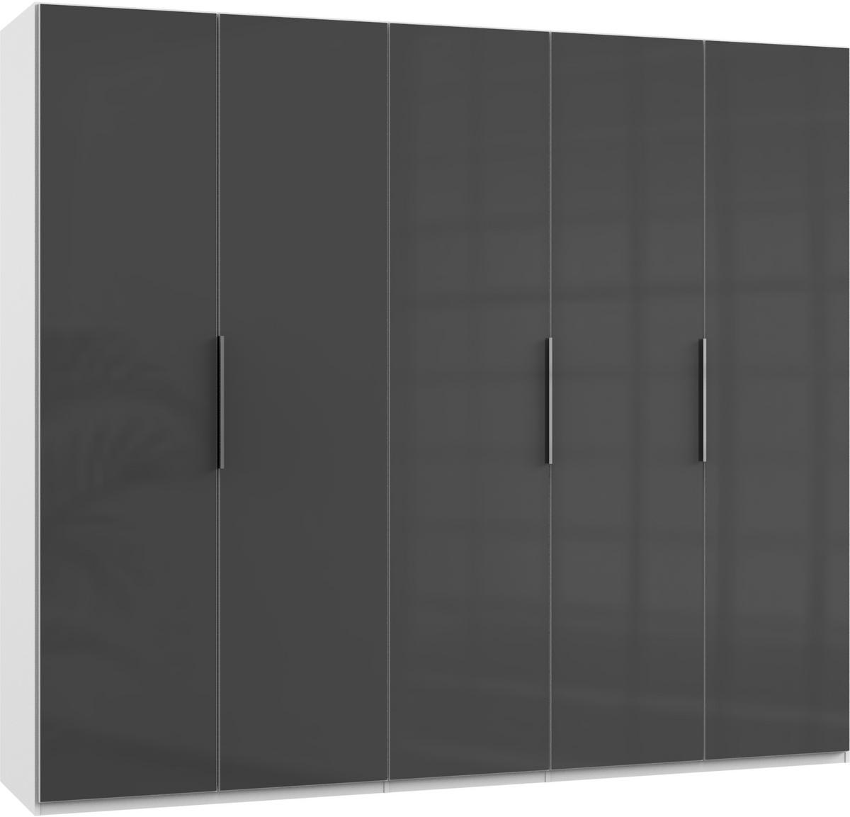 Mit den Abmessungen von etwa 250 x 216 x 58 cm (B x H x T) verfügt er über fünf Türen sowie über je drei Kleiderstangen und verstellbare Einlegeböden. Das Modell ist "Made in Germany" und in vielen weiteren Ausführungen erhältlich.