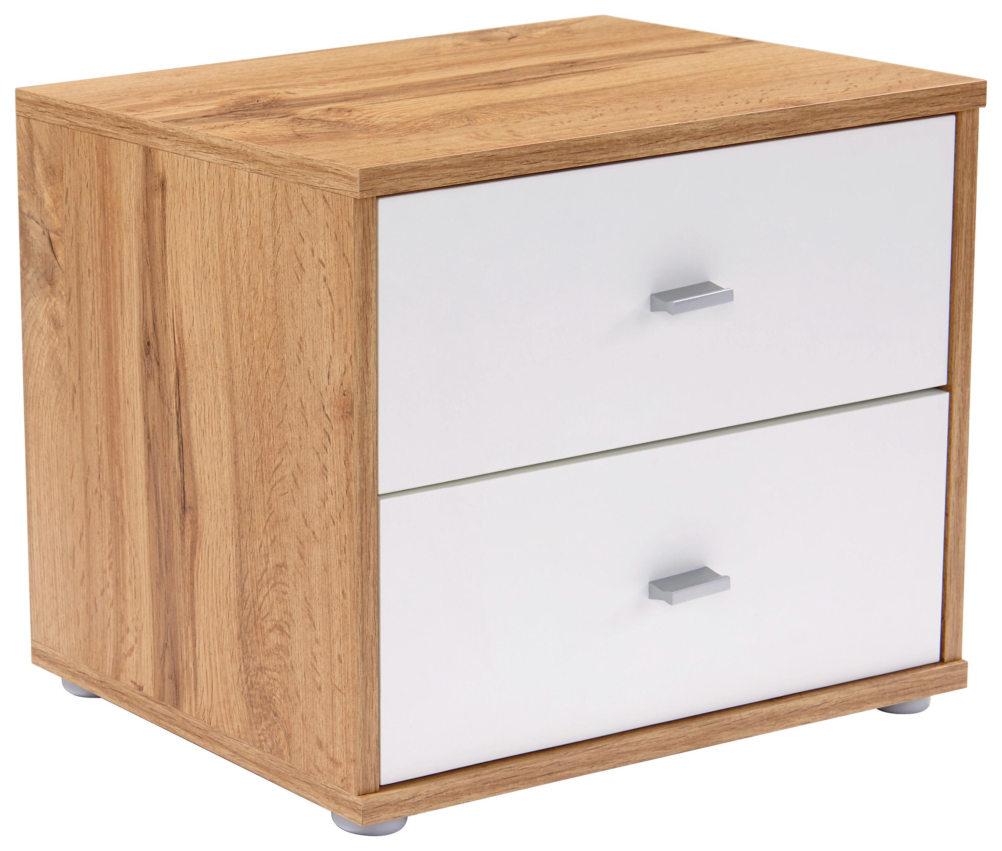 Der kompakte Nachttisch 4-YOU in Alpinweiß kombiniert mit Wotan Eiche Dekor ist die unverzichtbare Ablage neben Ihrem Bett für Wecker, Nachttischlampe, Bücher und vieles mehr.