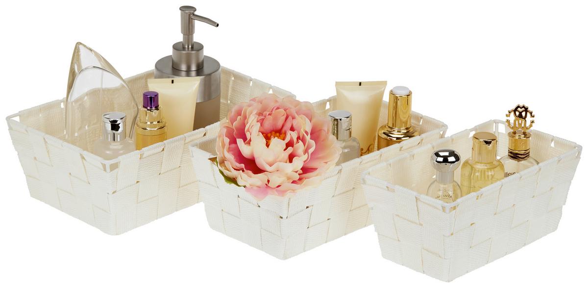 Die drei unterschiedlichen Korbgrößen bieten eine tolle Aufbewahrungsmöglichkeit für allerlei Alltagsgegenstände im Bad, Schlafzimmer oder Wohnbereich. Optisch gefallen die einzelnen Körbchen aus Kunststoff durch ihre Flechtoptik.