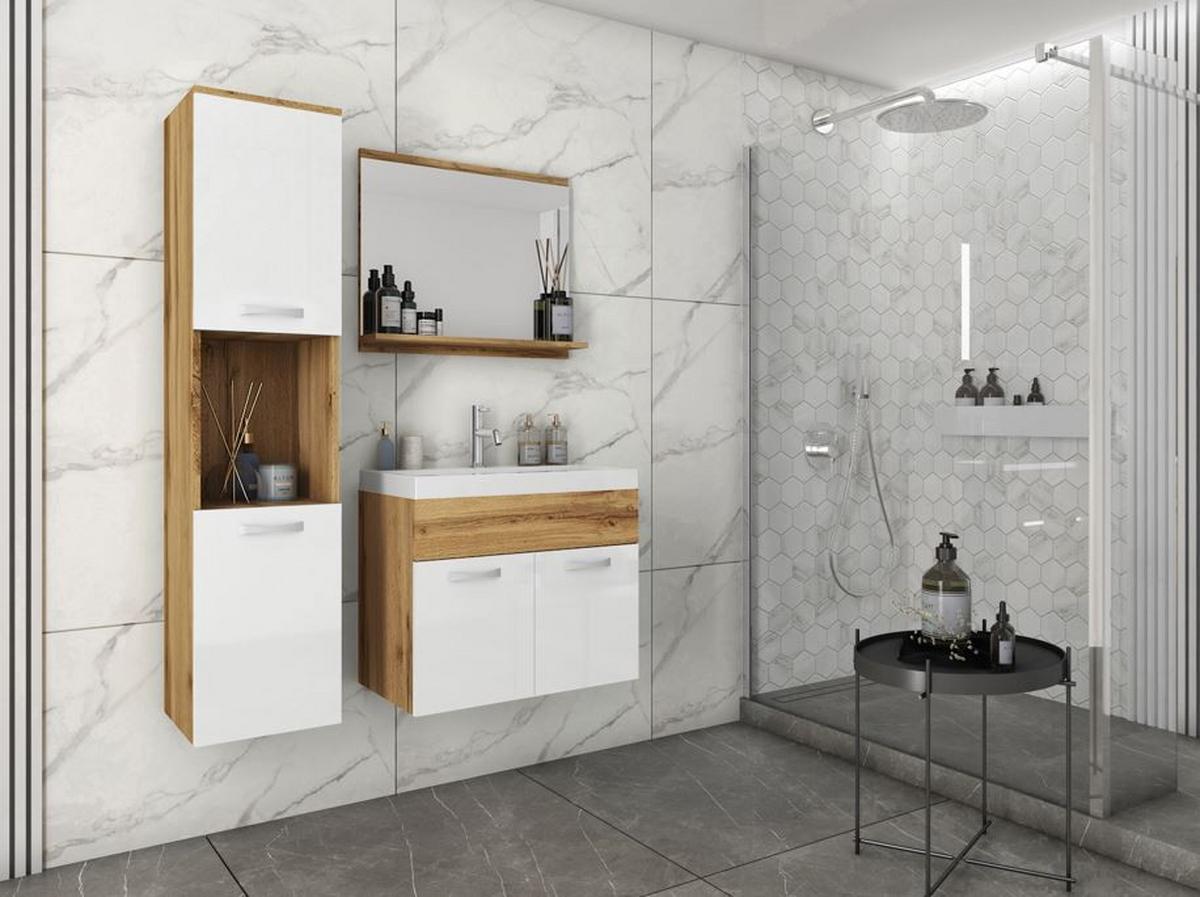 - Elemente: Waschtisch, Waschbecken, Spiegel mit Ablage, Hochschrank