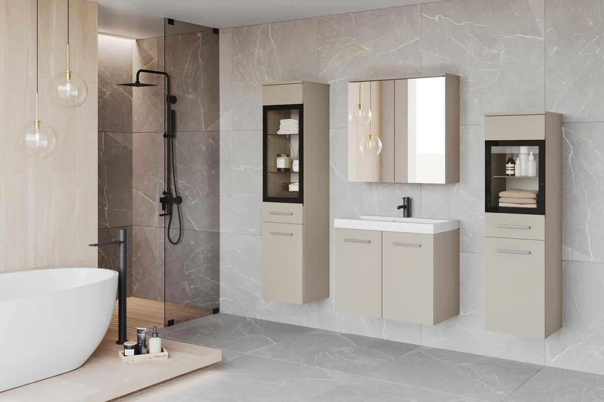 - Waschtisch mit Waschbecken, Spiegelschrank, Hochschrank, Midischrank