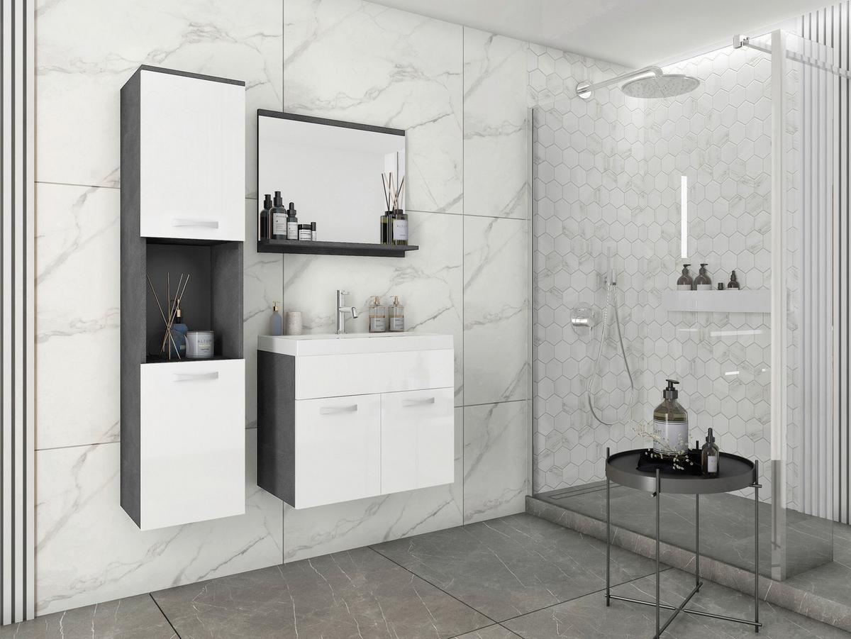 - Hochschrank, Spiegel, Waschbecken, Waschbeckenunterschrank