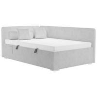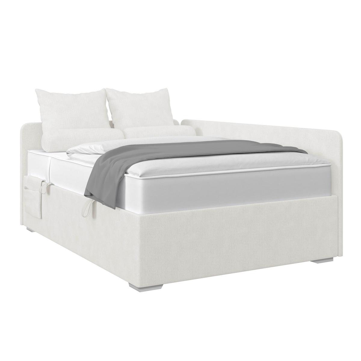 Das Bett REMI punktet mit einem weißen Bezug, einem gepolsterten Kopfteil sowie einem Bettkasten und einer Seitenwand. Der Lattenrost ist ebenfalls im Lieferumfang inbegriffen.