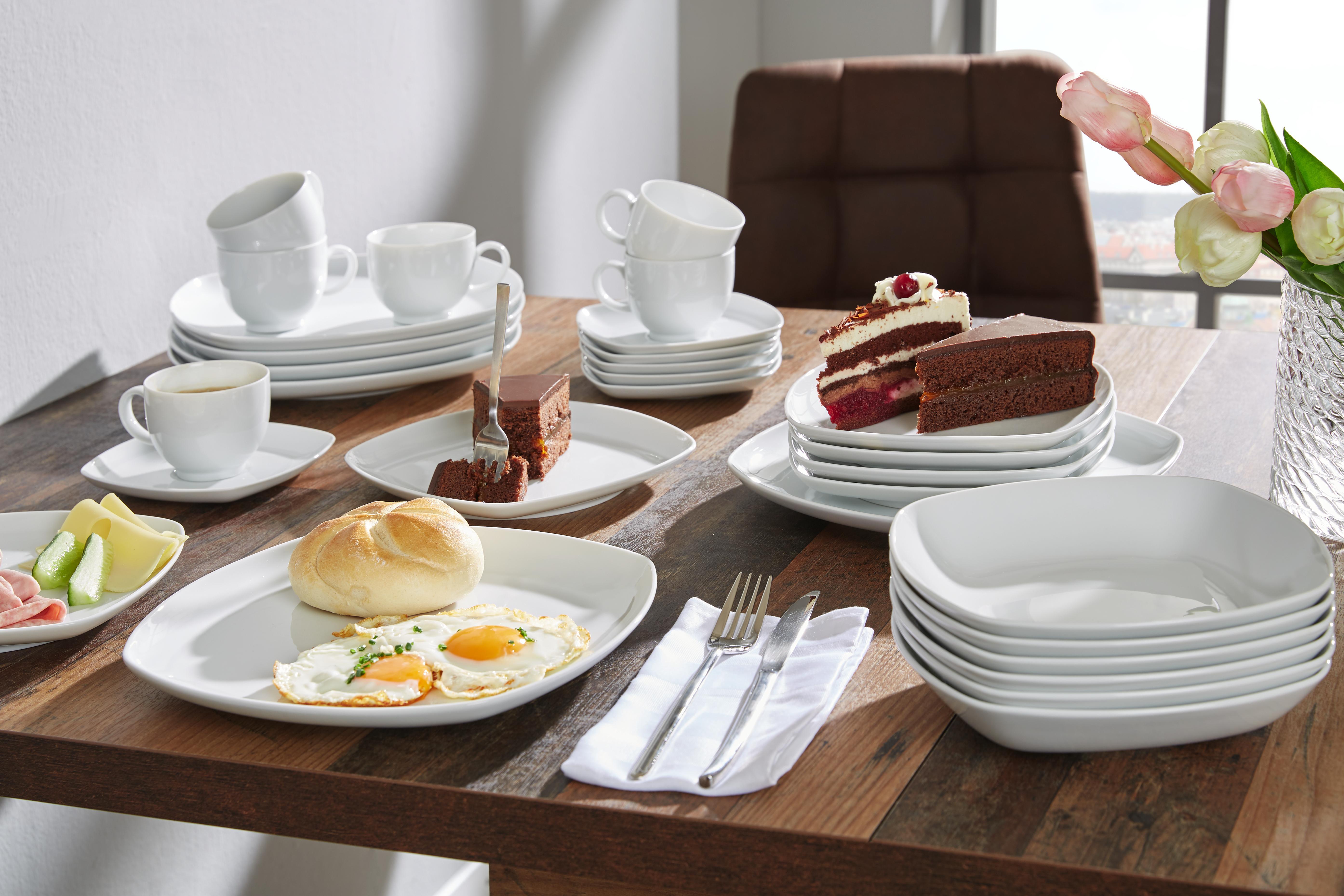 Zurückhaltend schlicht, durch die extravagante Formgebung jedoch trotzdem ein absoluter Hingucker auf Ihrem Tisch – so präsentiert sich das elegante Kombiservice SKETCH des namhaften deutschen Porzellanherstellers SELTMANN WEIDEN. Das 30-teilige Service besticht mit seinem außergewöhnlichen, eckigen Design in klassischem Weiß. Es beinhaltet die Ausstattung für insgesamt 6 Personen mit jeweils 6 Stück Speise-, Suppen- und Desserttellern sowie Kaffeetassen mit Untertassen. Das hochwertige Porzellan gewährleistet die langanhaltende Schönheit des Geschirrs und ist zudem spülmaschinen- und mikrowellengeeignet. Ein zeitloses Service, das auch Ihrem Tisch bei Fest und Feier, aber auch im Alltag Stil und Charme verleiht!