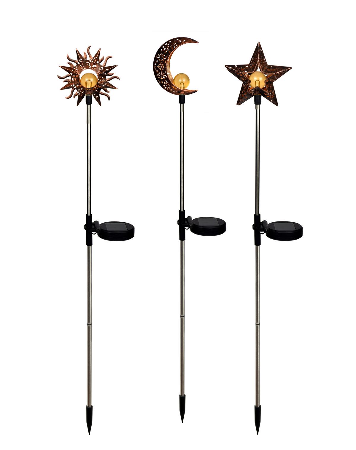 Die bronzefarbene Solarleuchte RAFAEL von HOMEZONE mit einem dekorativen Element - Sonne, Mond oder Stern - beleuchtet Ihre Blumenkübel auf Balkon oder Terrasse und macht sich auch im Beet ausgesprochen hübsch. Aus Metall undKunststoff gefertigt, misst sie etwa 12 x 5,5 x 82 cm (L x B x H) und kann per Erdspieß im Boden verankert werden.