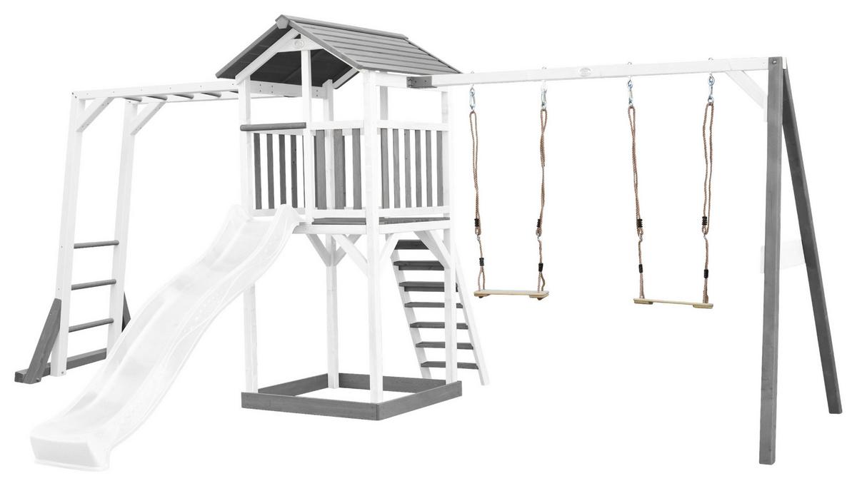 - Bestandteile: Rutsche, Leiter, Turm, Sandkiste, Podest, Schaukel, Kletterwand