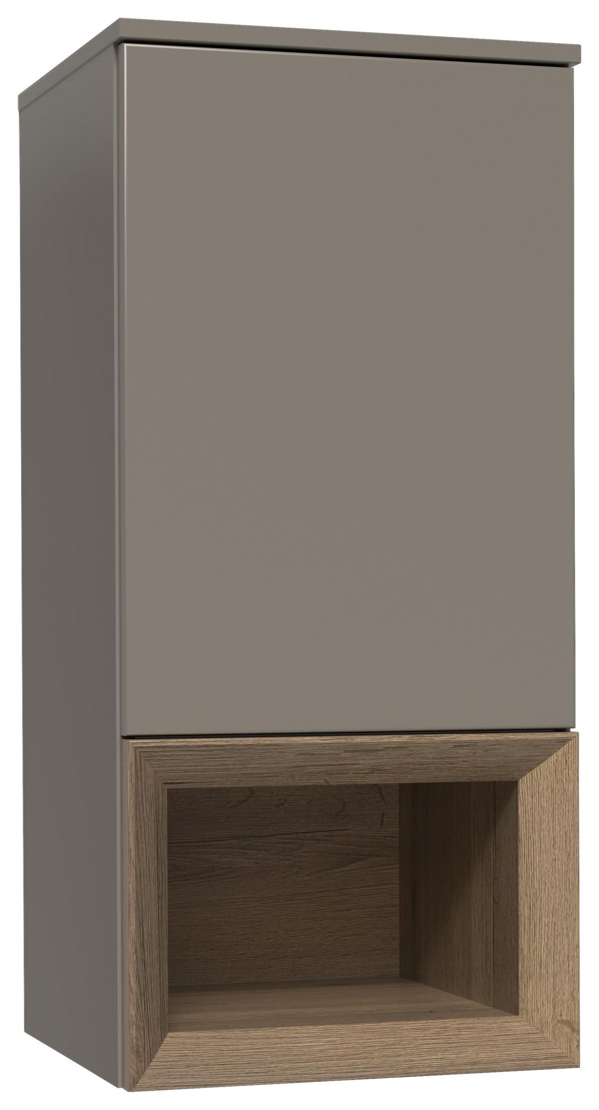 Das Hängeelement LAS VEGAS von VERTICO überzeugt mit modernem, puristischem Design in Taupegrau und Holzdekor – und bietet auf 40 cm Breite praktischen Stauraum.